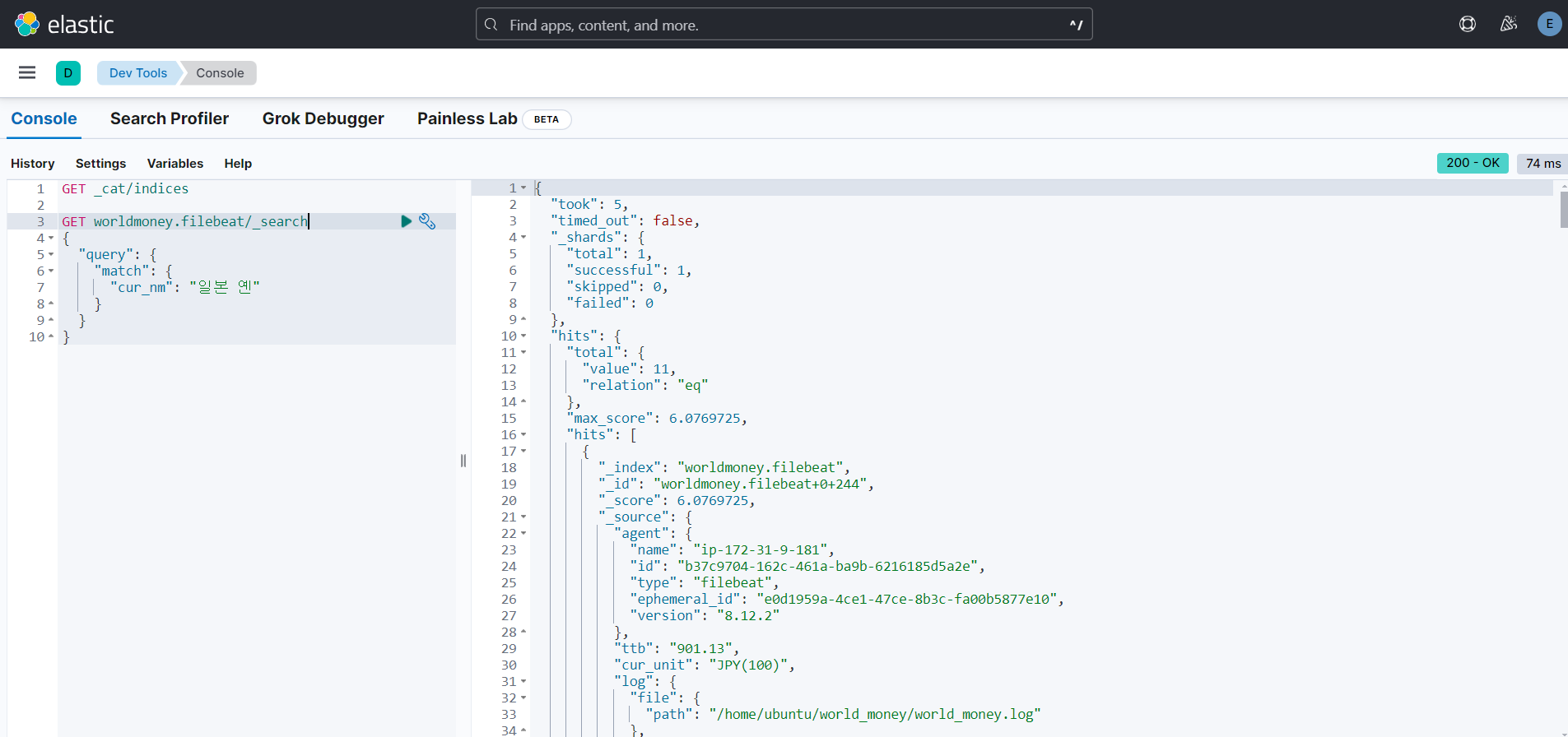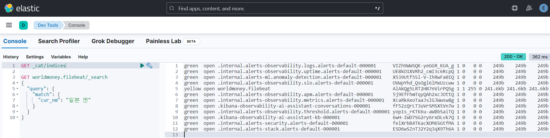 - kibana의 devtools를 통해 쉽고 빠르게 확인이 가능.